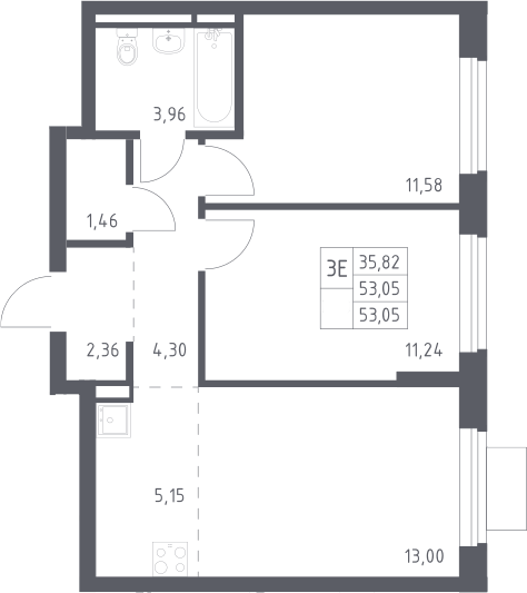 3-комнатная квартира № 10, 53.05 м2 с отделкой 2 эт.