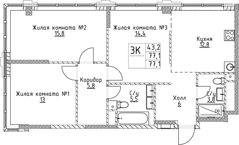 3-комнатная квартира № 83, 77.10 м2 без отделки 11 эт.