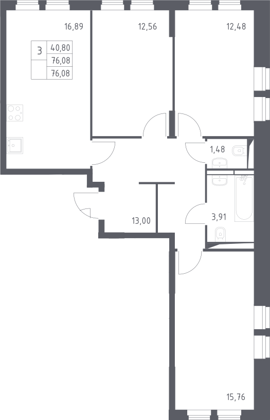 3-комнатная квартира № 21, 76.08 м2 с отделкой 6 эт.