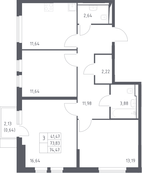 3-комнатная квартира № 81, 73.83 м2 с отделкой 4 эт.