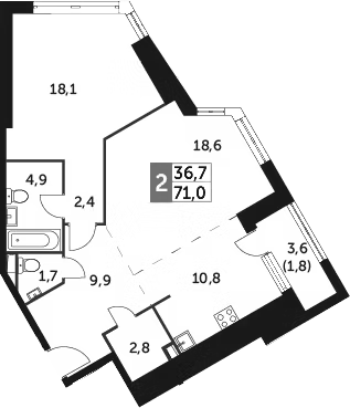 2-комнатная квартира № 1078, 69.20 м2 с отделкой 6 эт.