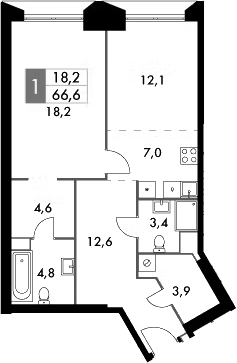 1-комнатная квартира № 1268, 66.60 м2 без отделки 46 эт.
