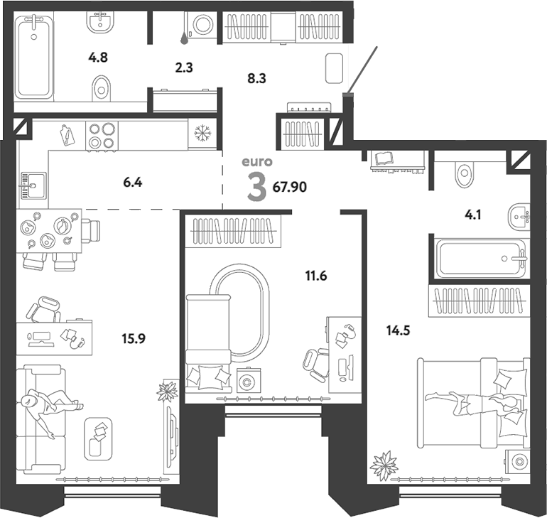 3-комнатная квартира № 1060, 67.90 м2 без отделки 17 эт.