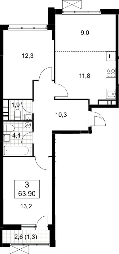 3-комнатная квартира № 125, 62.60 м2 без отделки 8 эт.