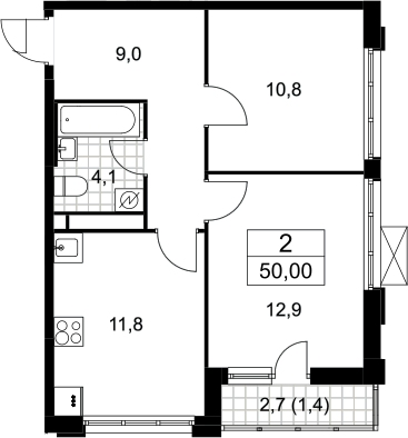 2-комнатная квартира № 80, 48.60 м2 без отделки 15 эт.