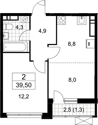 2-комнатная квартира № 152, 38.20 м2 без отделки 14 эт.