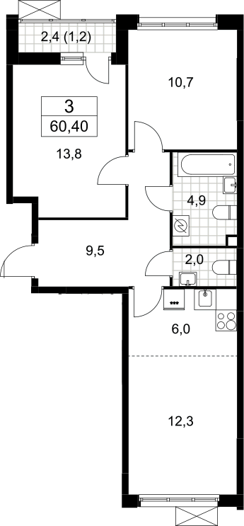 3-комнатная квартира № 216, 59.20 м2 без отделки 2 эт.