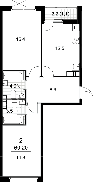 2-комнатная квартира № 200, 59.10 м2 без отделки 8 эт.