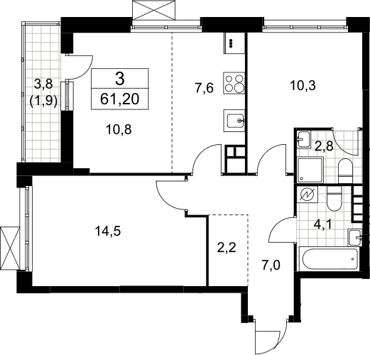 3-комнатная квартира № 312, 59.30 м2 без отделки 4 эт.