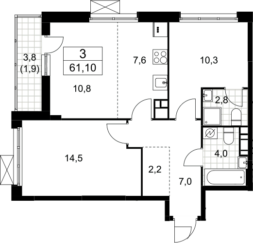 3-комнатная квартира № 402, 59.20 м2 без отделки 14 эт.