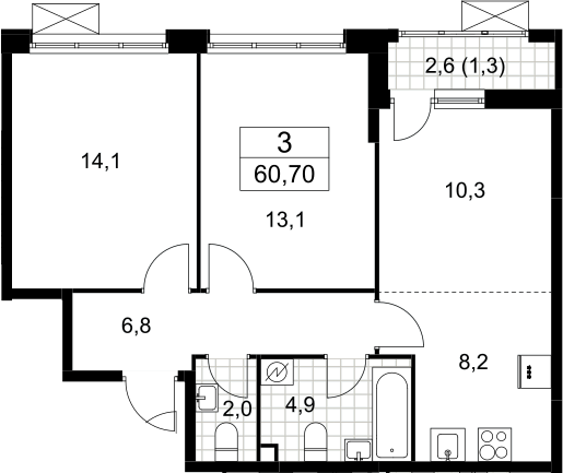 3-комнатная квартира № 637, 59.40 м2 с отделкой 2 эт.