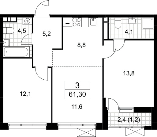 3-комнатная квартира № 668, 60.10 м2 с отделкой 8 эт.