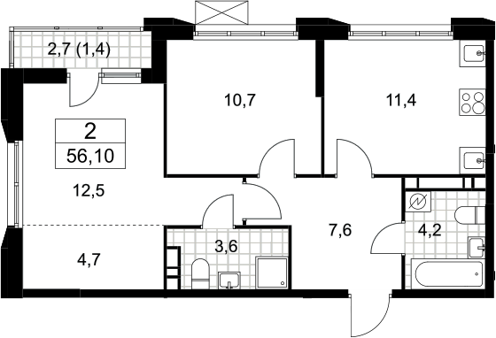 2-комнатная квартира № 797, 54.70 м2 с отделкой 9 эт.