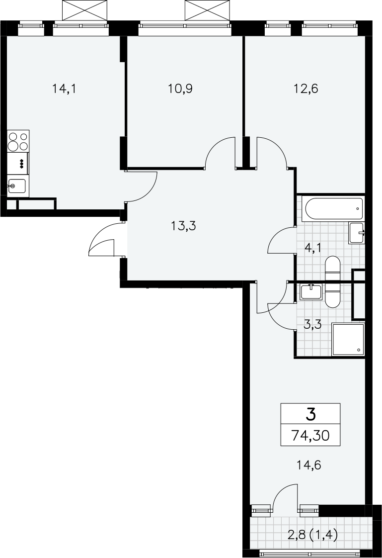 3-комнатная квартира № 1026, 72.90 м2 с отделкой 8 эт.