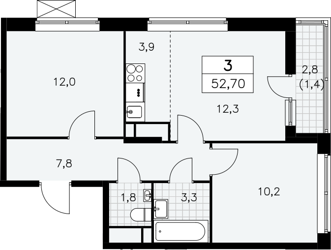 3-комнатная квартира № 743, 51.30 м2 без отделки 14 эт.