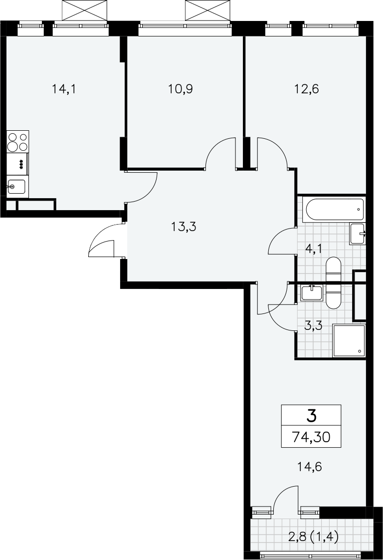 3-комнатная квартира № 1031, 72.90 м2 без отделки 9 эт.