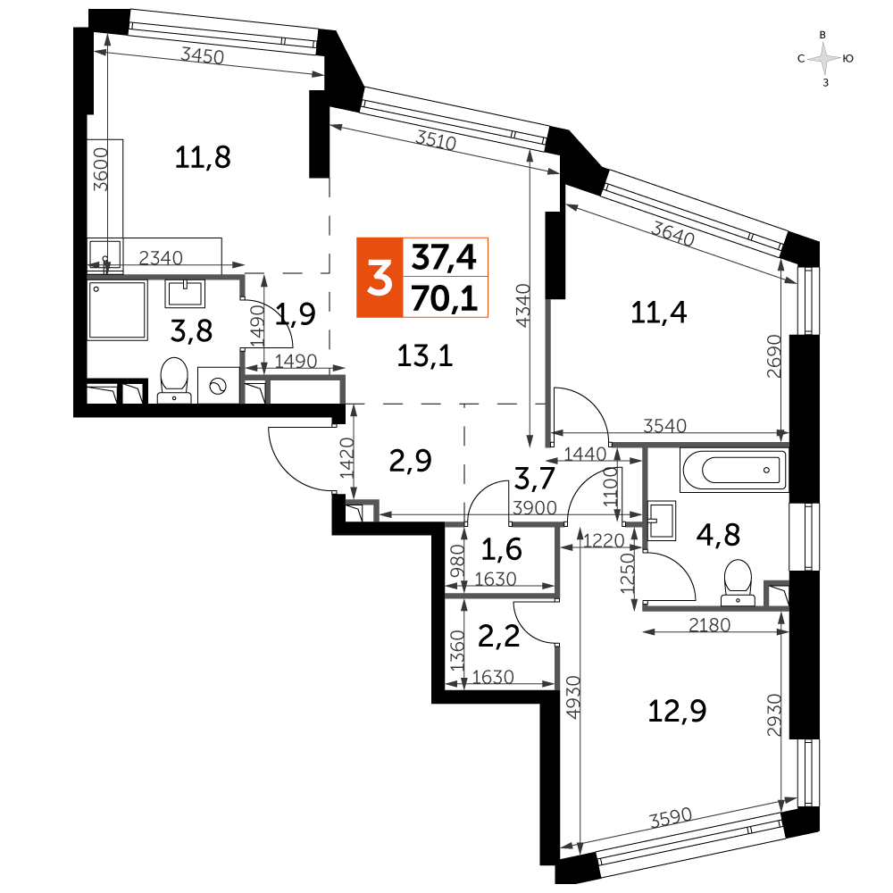 3-комнатная квартира № 218, 70.10 м2 white-box 3 эт.