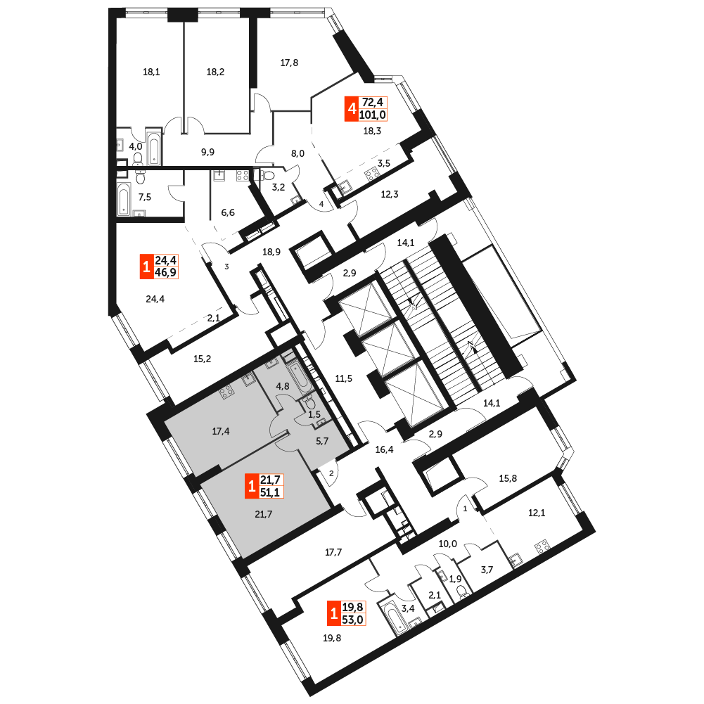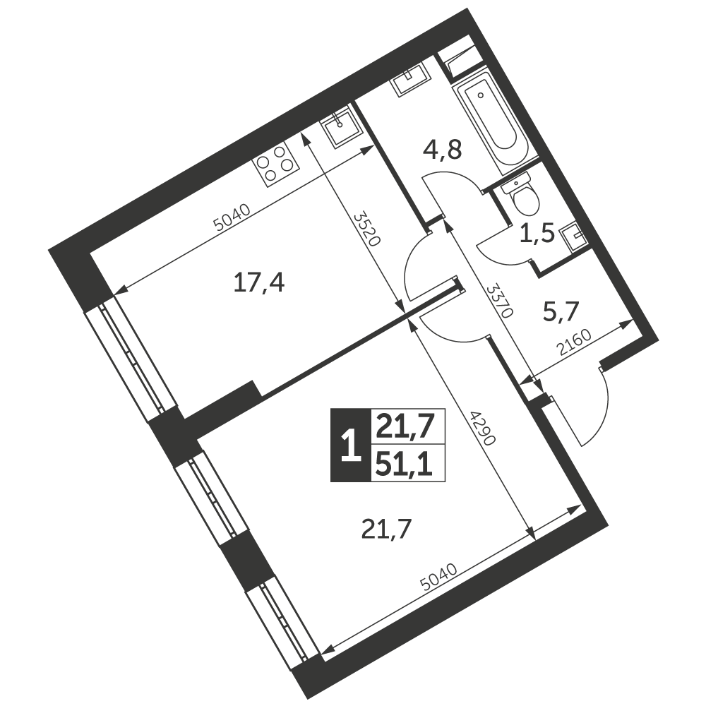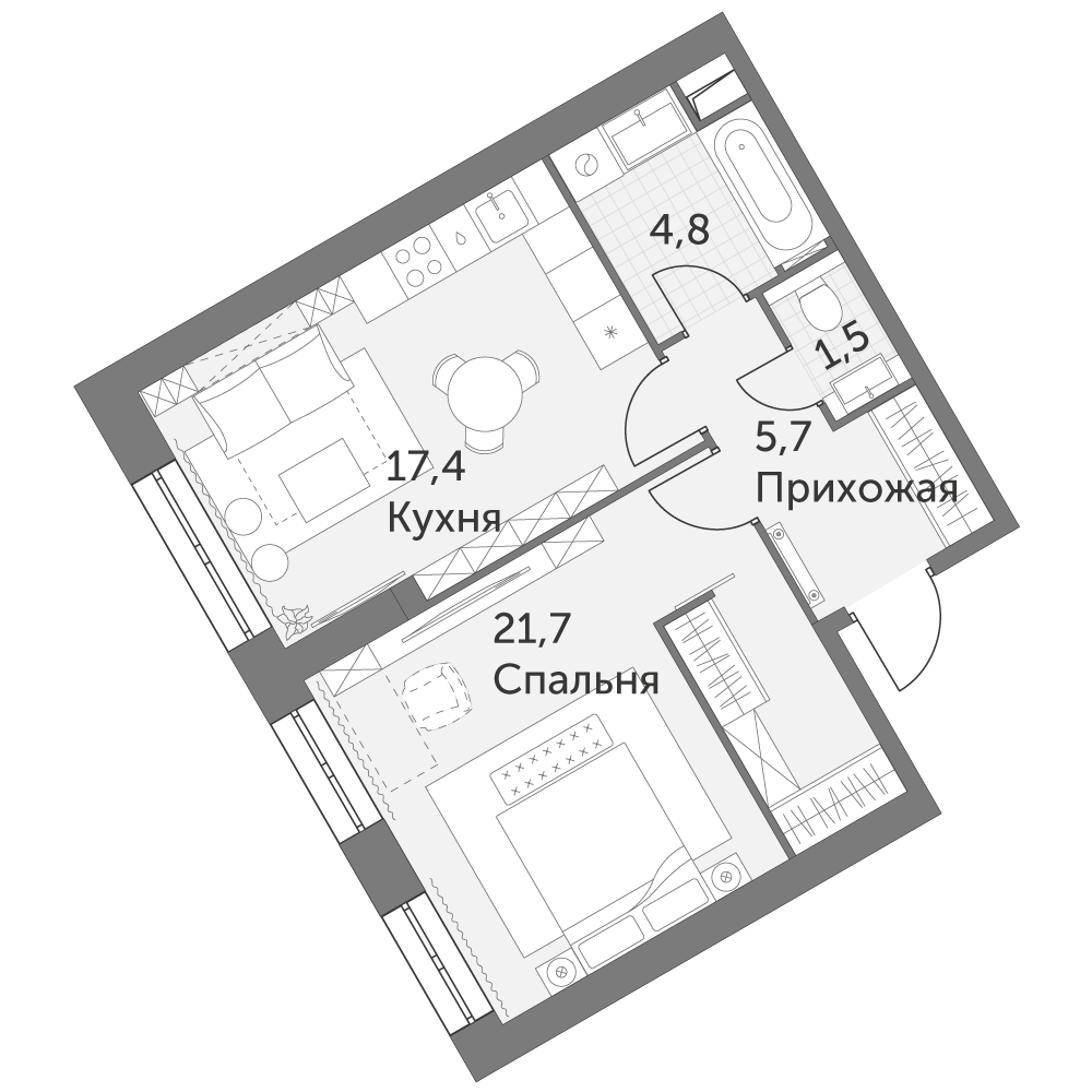 1-комнатная квартира № 1160, 51.10 м2 white-box 27 эт.
