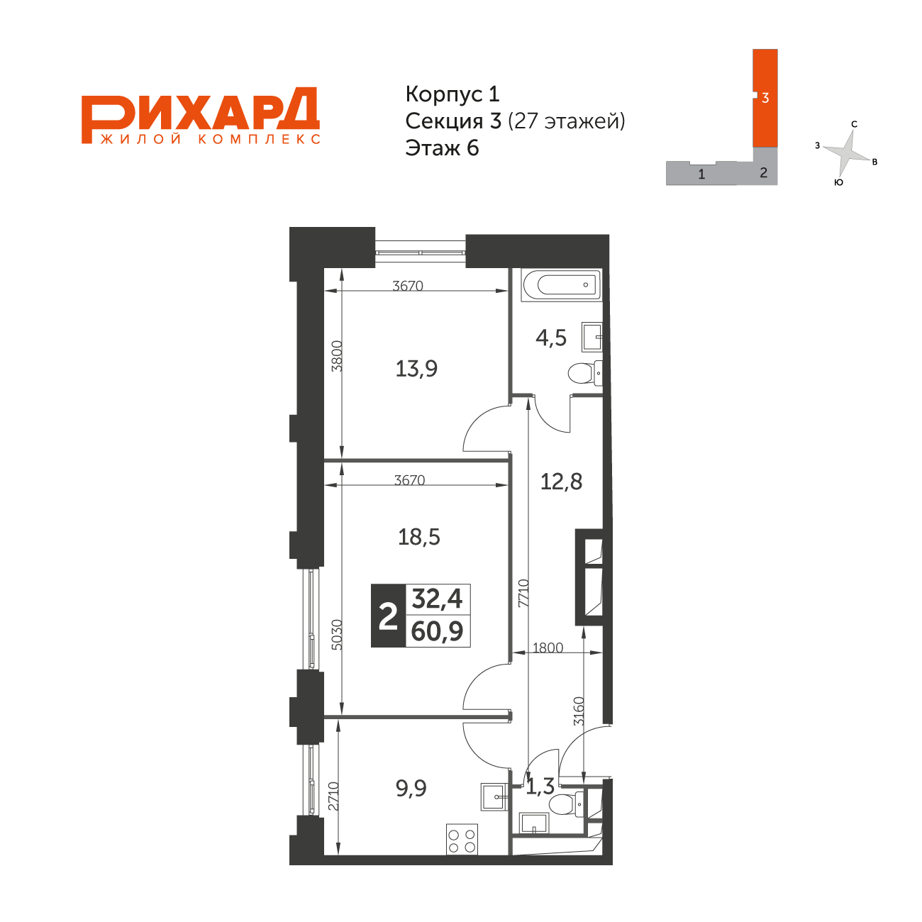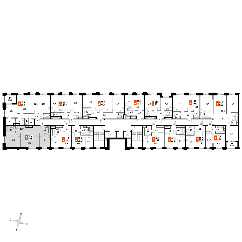 2-комнатная квартира № 249, 61.10 м2 без отделки 6 эт.