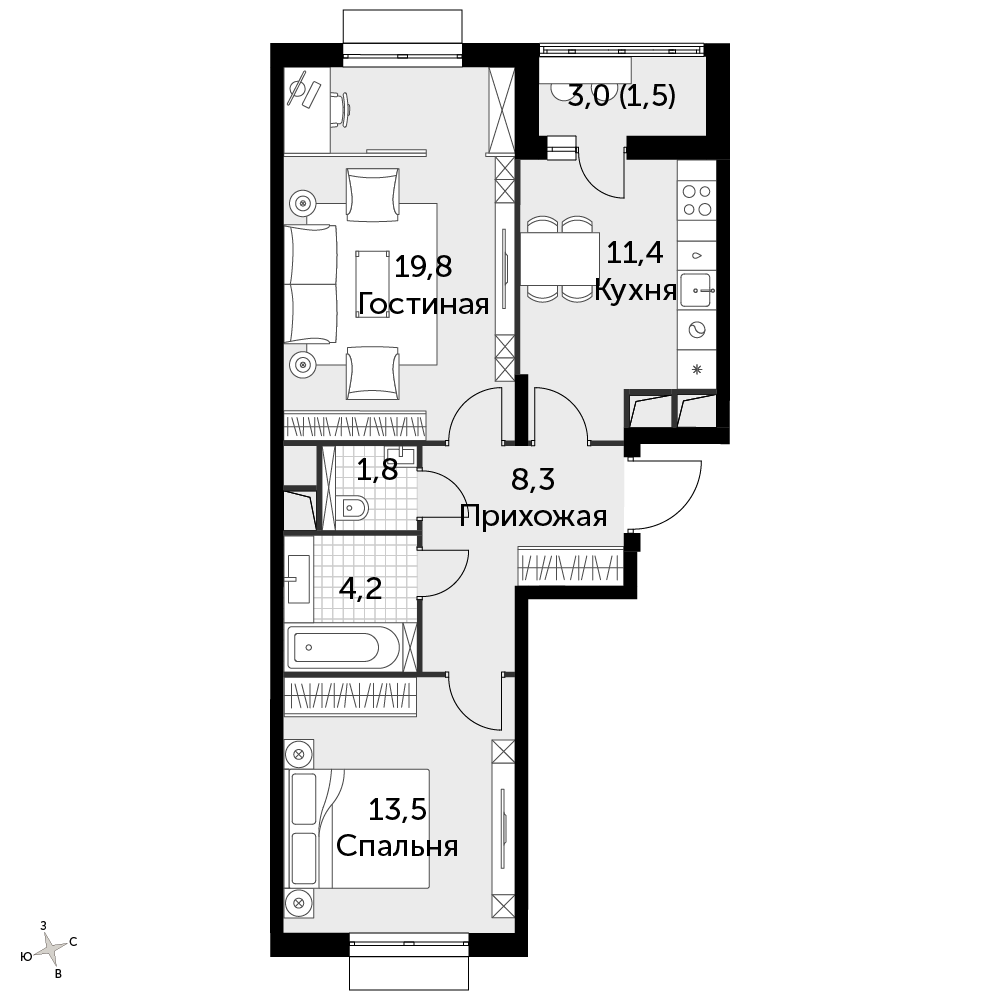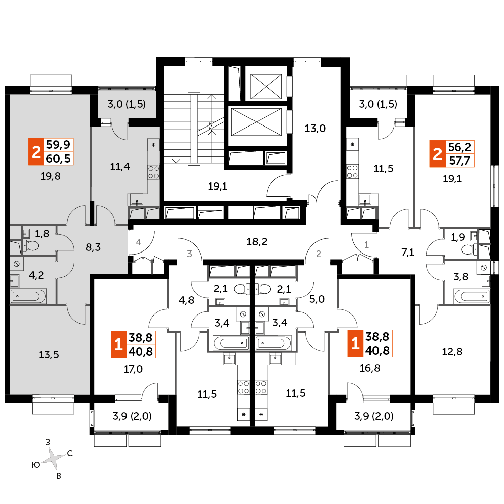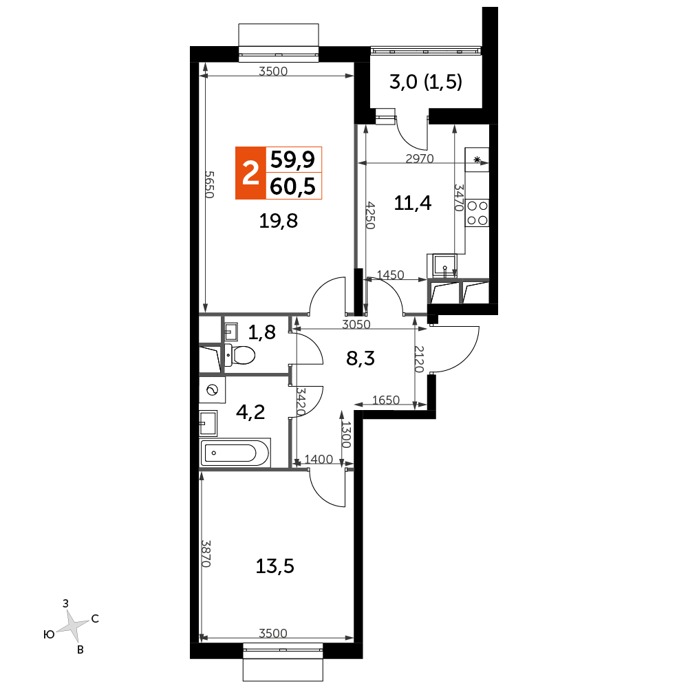 2-комнатная квартира № 1635, 60.50 м2 white-box 10 эт.