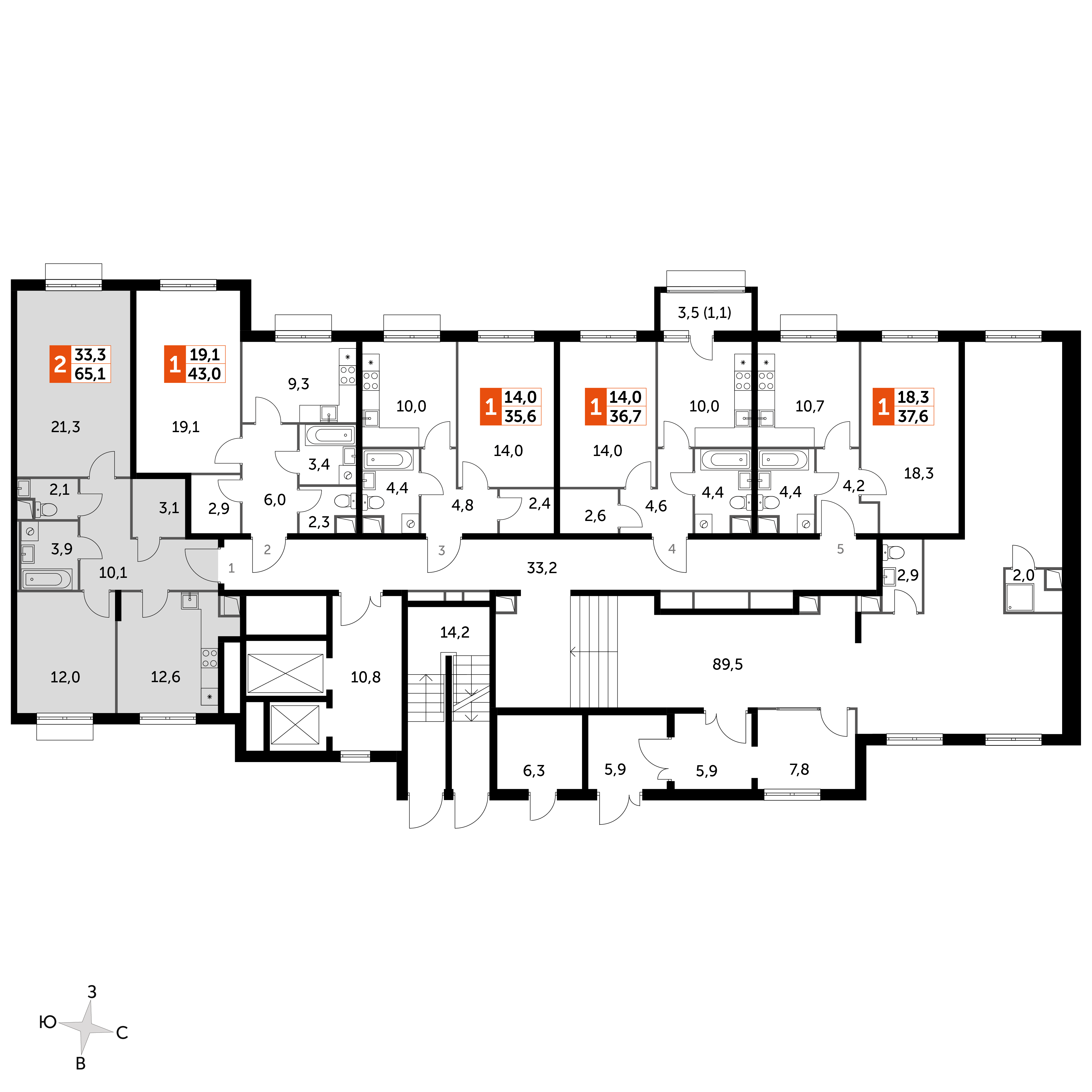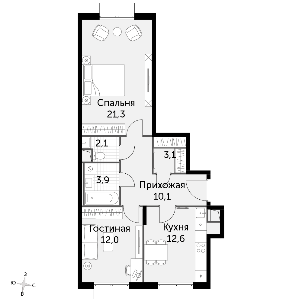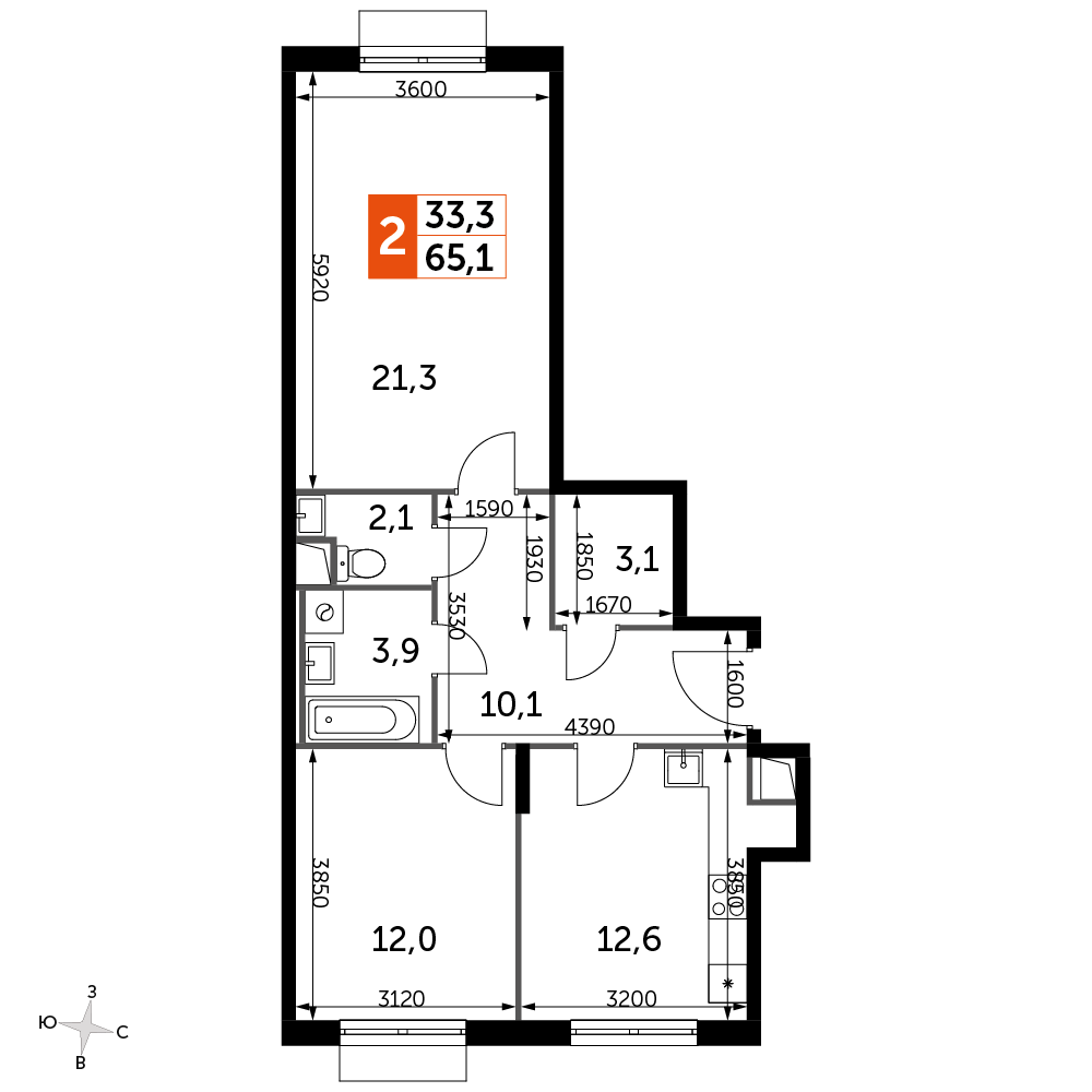 2-комнатная квартира № 610, 65.10 м2 с отделкой 1 эт.