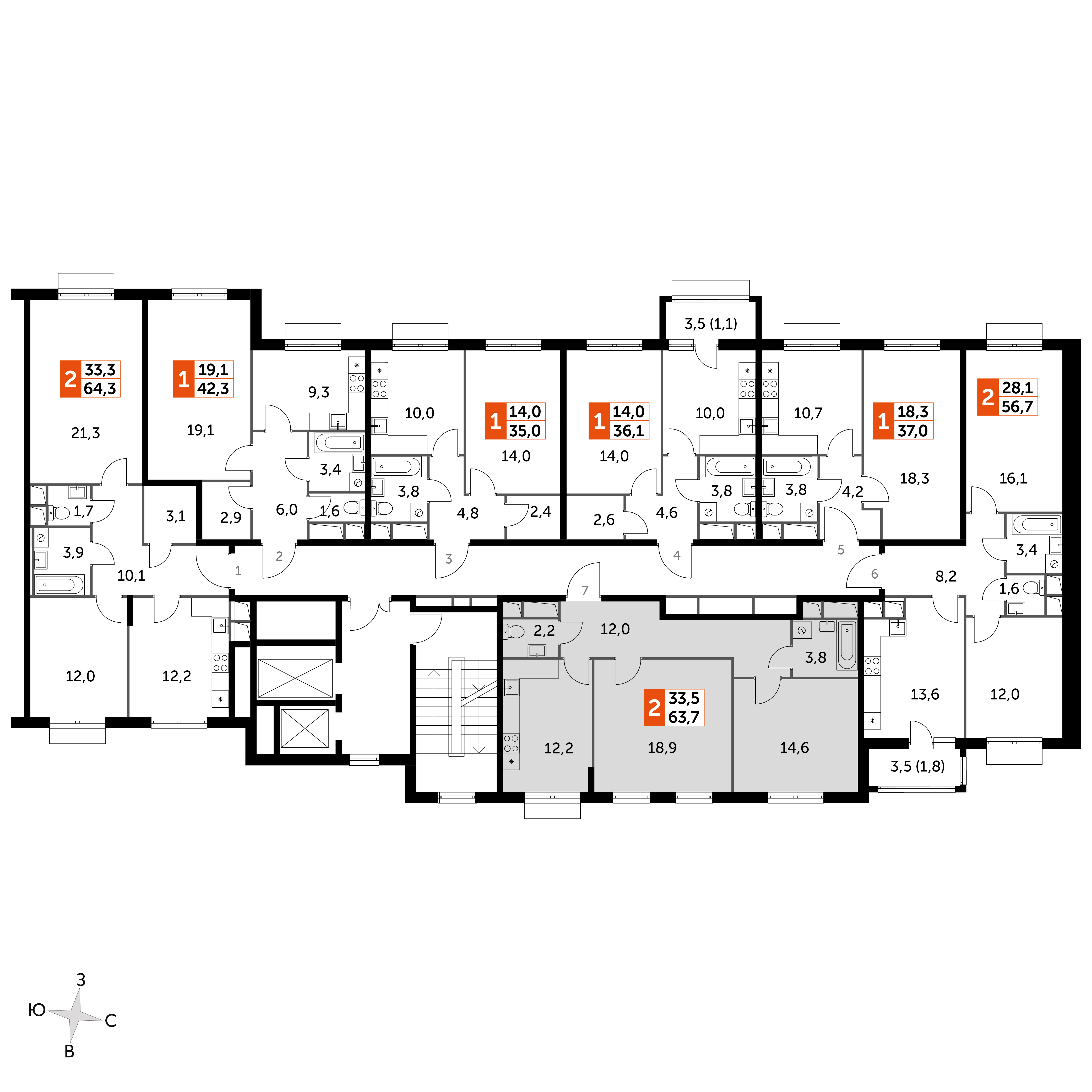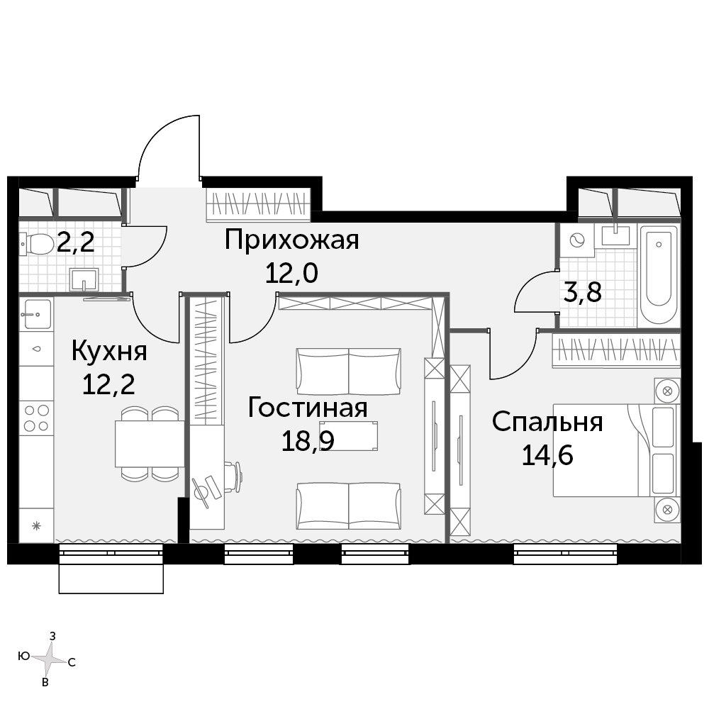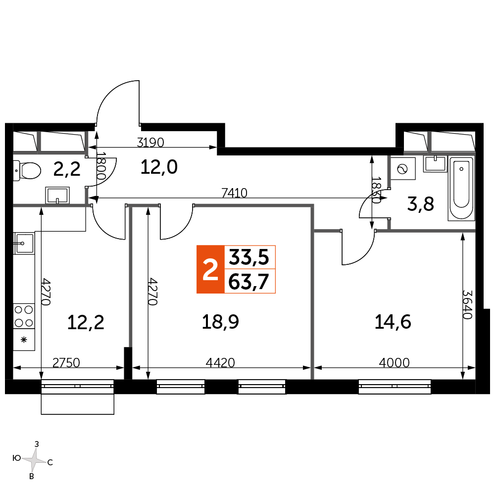 2-комнатная квартира № 663, 63.70 м2 с отделкой 8 эт.