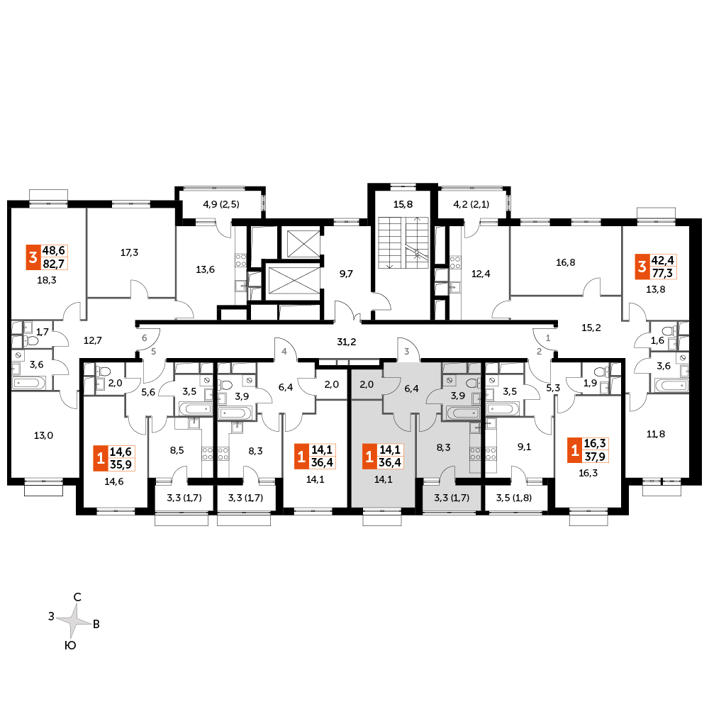 1-комнатная квартира № 96, 36.40 м2 без отделки 7 эт.