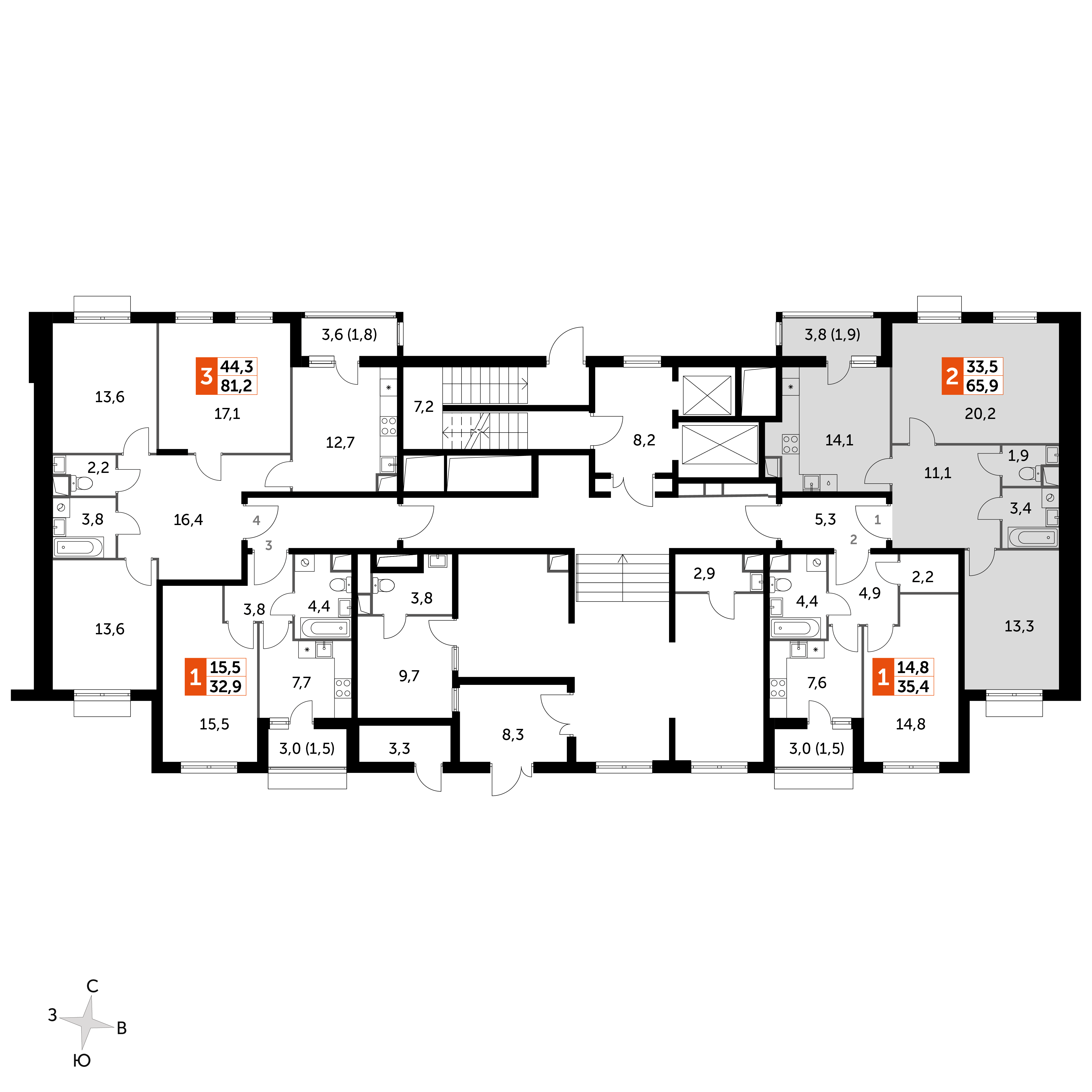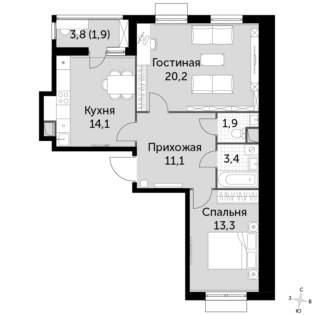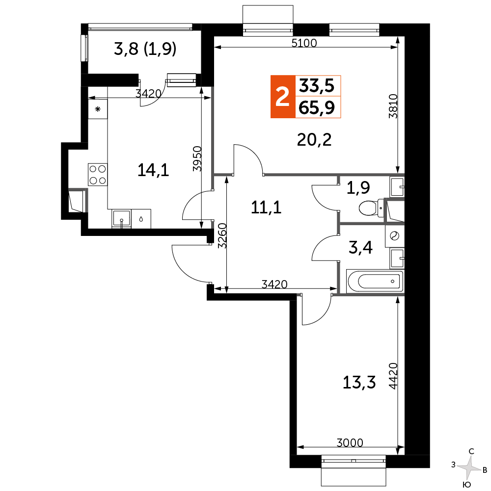 2-комнатная квартира № 257, 65.90 м2 с отделкой 1 эт.