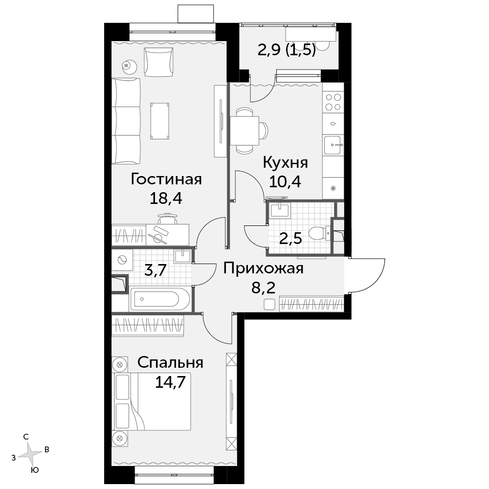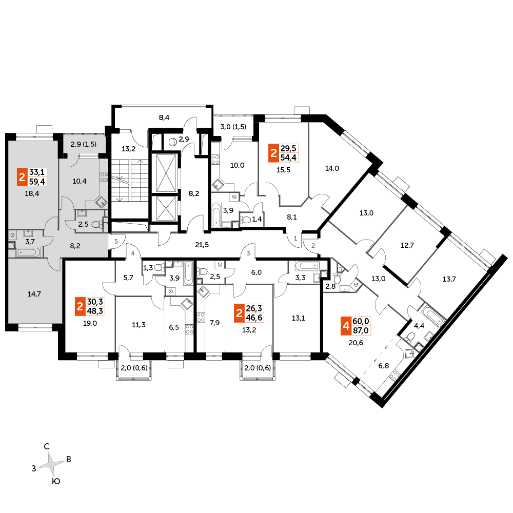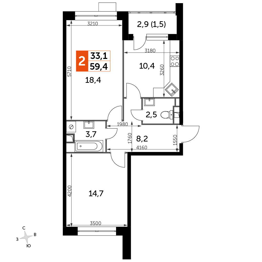 2-комнатная квартира № 1188, 59.40 м2 без отделки 2 эт.