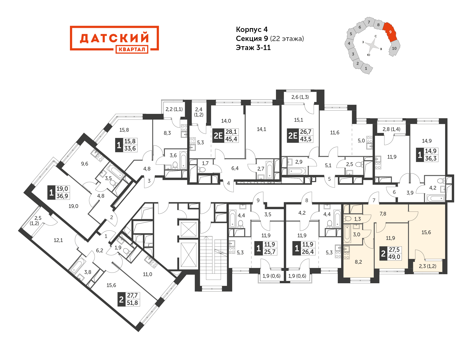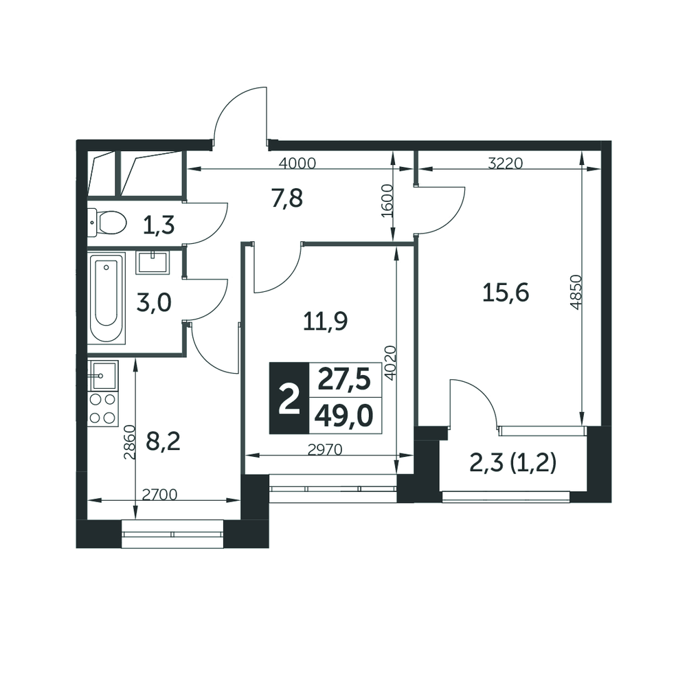2-комнатная квартира № 364, 48.70 м2 без отделки 6 эт.