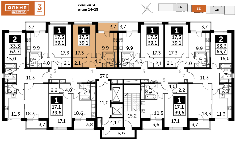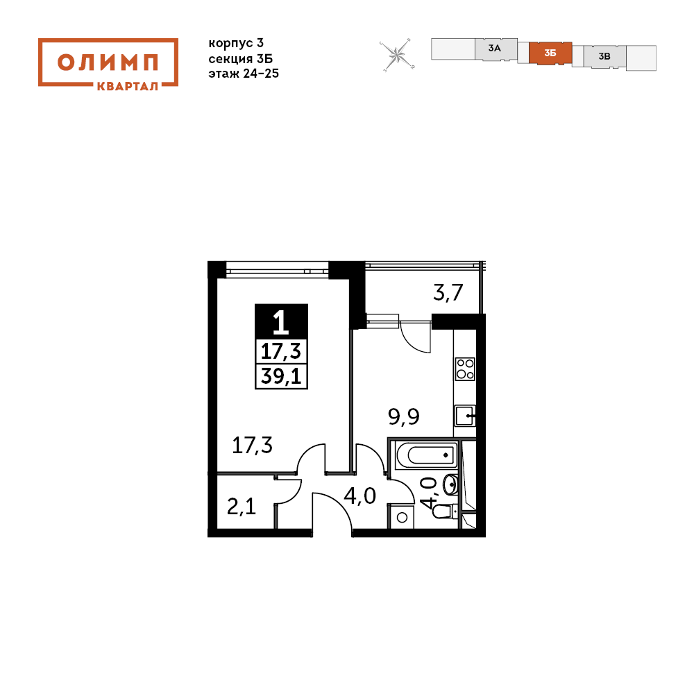 1-комнатная квартира № 324, 38.90 м2 без отделки 24 эт.