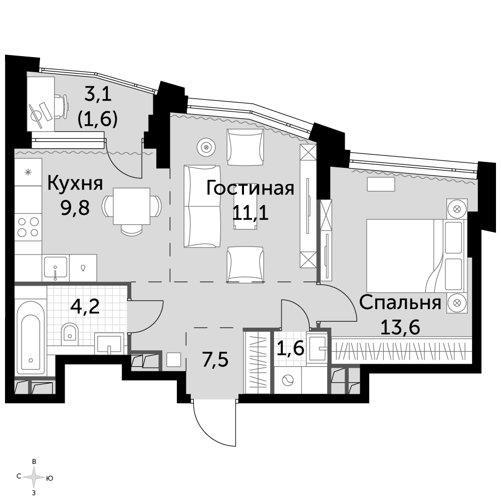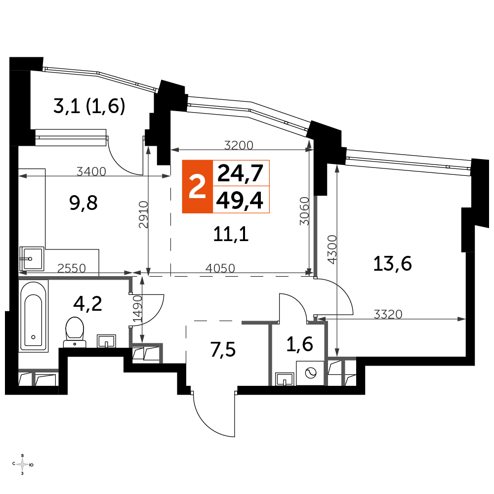 2-комнатная квартира № 28, 49.40 м2 без отделки 6 эт.