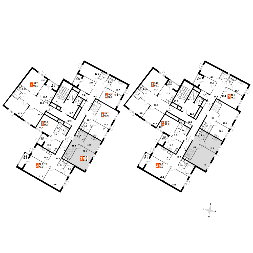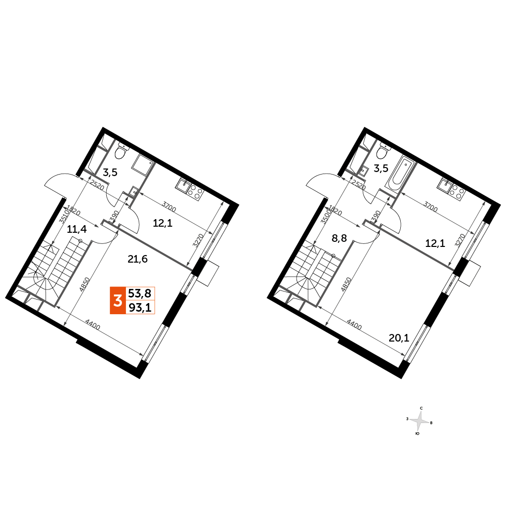 3-комнатная квартира № 64, 93.10 м2 без отделки 12 эт.