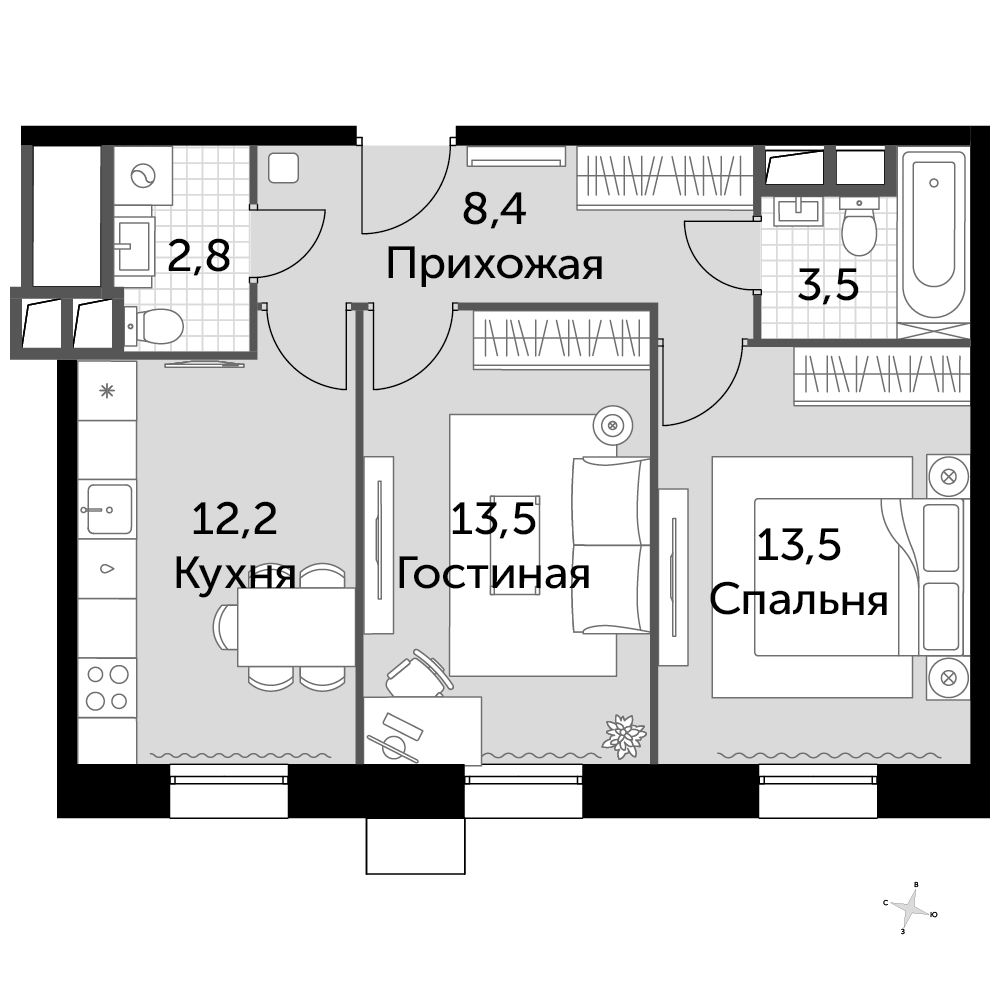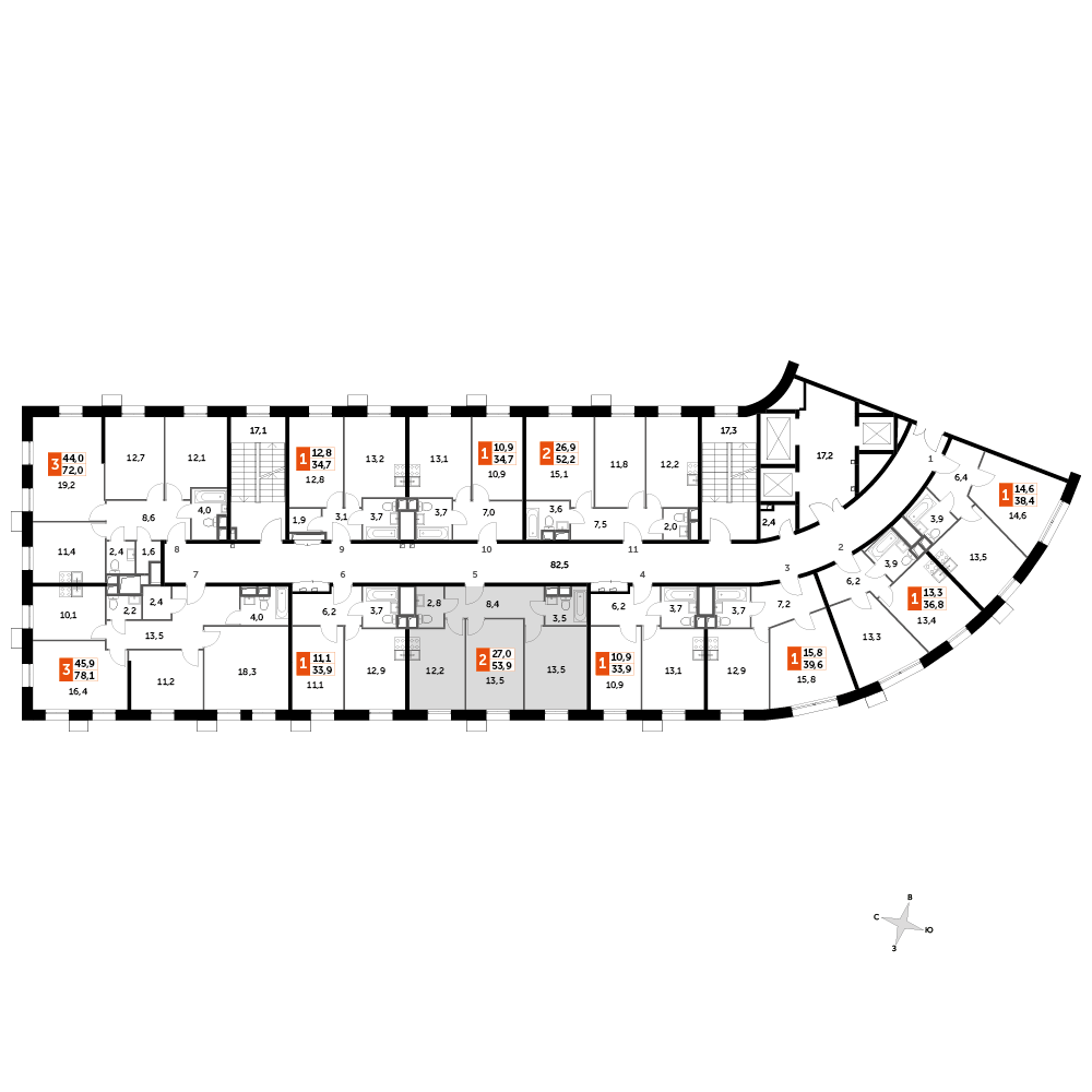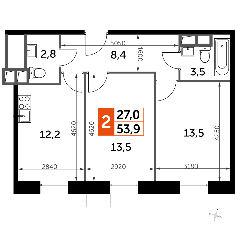 2-комнатная квартира № 49, 53.90 м2 без отделки 6 эт.