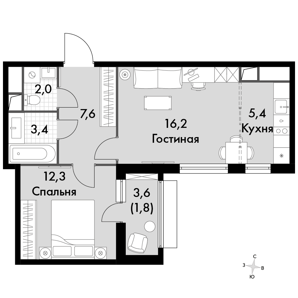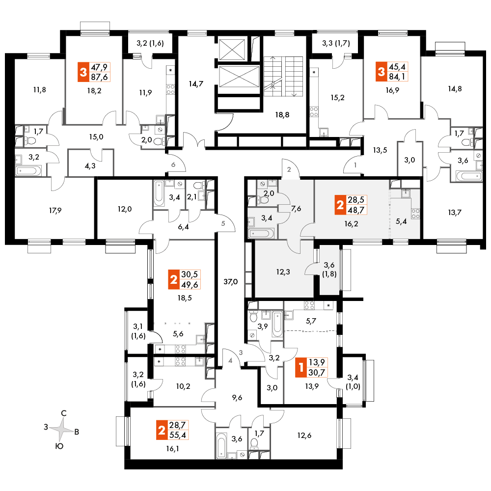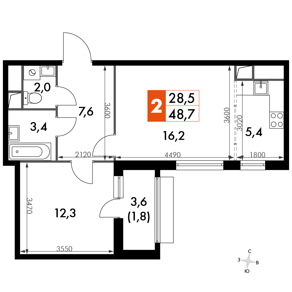 2-комнатная квартира № 757, 48.70 м2 white-box 13 эт.