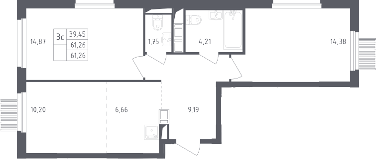 3-комнатная квартира № 824, 61.26 м2 с отделкой 13 эт.