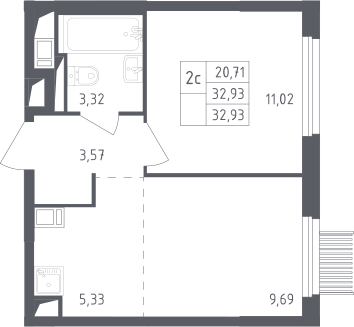 2-комнатная квартира № 716, 32.93 м2 с отделкой 3 эт.