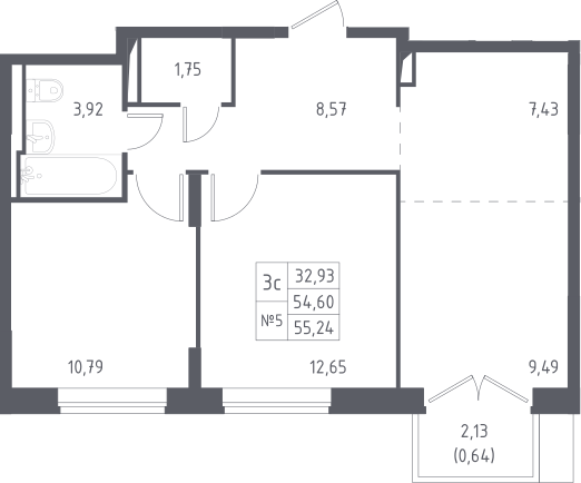 3-комнатная квартира № 133, 54.60 м2 с отделкой 5 эт.