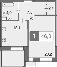 1-комнатная квартира № 35, 46.40 м2 без отделки 3 эт.