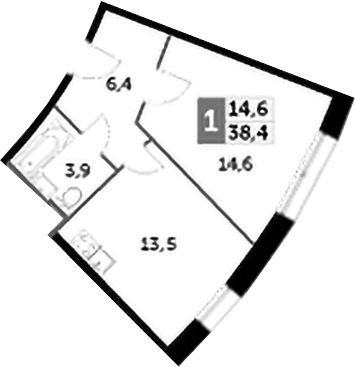 1-комнатная квартира № 1, 38.40 м2 без отделки 2 эт.