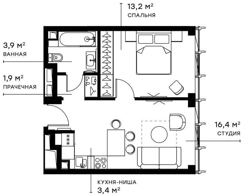 2-комнатная квартира № 170, 38.80 м2 с отделкой 16 эт.