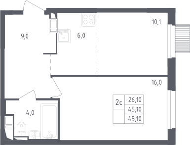 2-комнатная квартира № 1001, 45.10 м2 с отделкой 9 эт.