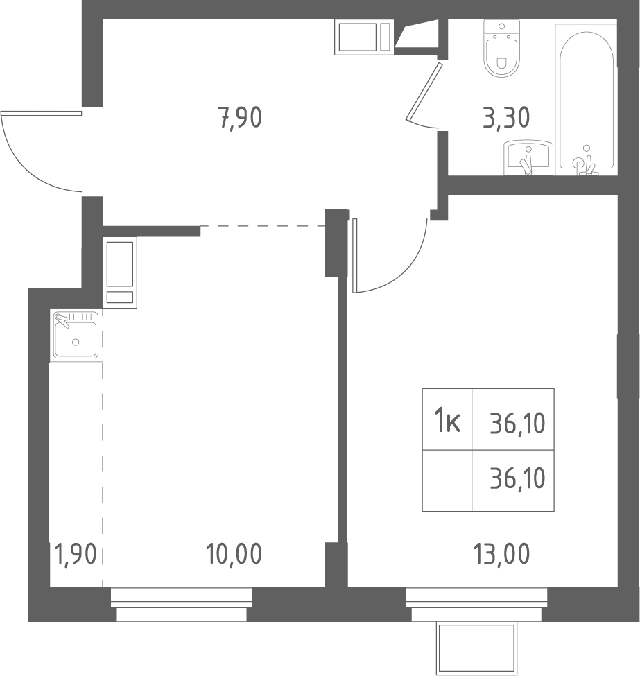2-комнатная квартира № 290, 36.10 м2 с отделкой 15 эт.
