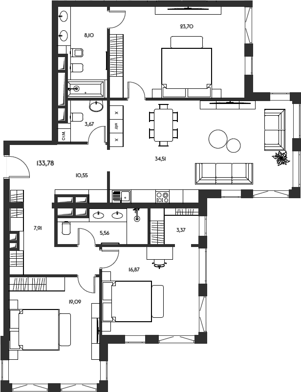 4-комнатная квартира № 87, 134.40 м2 с отделкой 15 эт.