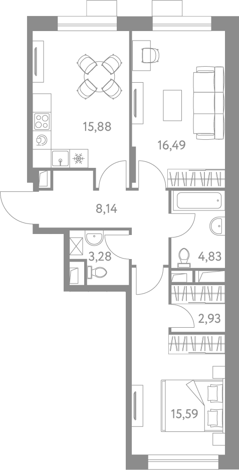 3-комнатная квартира № 1, 67.14 м2 без отделки 3 эт.