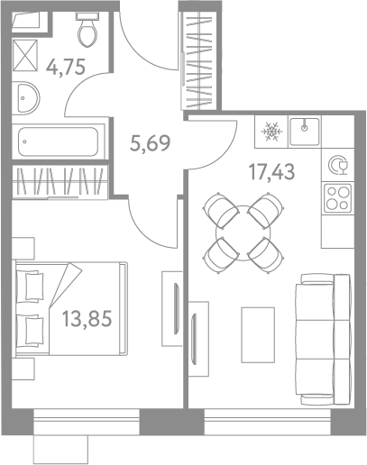 2-комнатная квартира № 2, 41.72 м2 без отделки 3 эт.