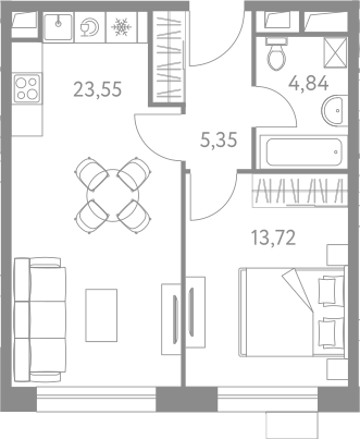 2-комнатная квартира № 3, 47.46 м2 без отделки 3 эт.