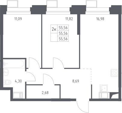 3-комнатная квартира № 474, 55.56 м2 с отделкой 12 эт.