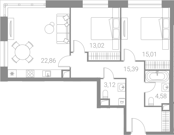 3-комнатная квартира № 9, 73.98 м2 без отделки 2 эт.