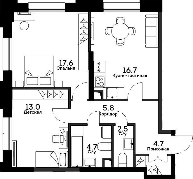 3-комнатная квартира № 95, 65.00 м2 без отделки 10 эт.